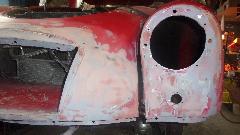 Okay, so back to the slow-going surface finishing. And these are the pictures you're not supposed to show anyone, one minute before applying primer paint to hide everything. If you have ever seen this, the surfaces are smooth, but the various colors and patterns hint at the extent of the damage before repairs, and the irregularities on the surface even after repair needing to be smoothed over. A few minutes later it was monochrome in grey primer again, and after some drying time we got to put one bolt back in each wing and re-install the lights to be street legal again tonight. Sorry, just got too busy and didn't get any more pictures, but check the last picture form yesterday to get essentially the same view.