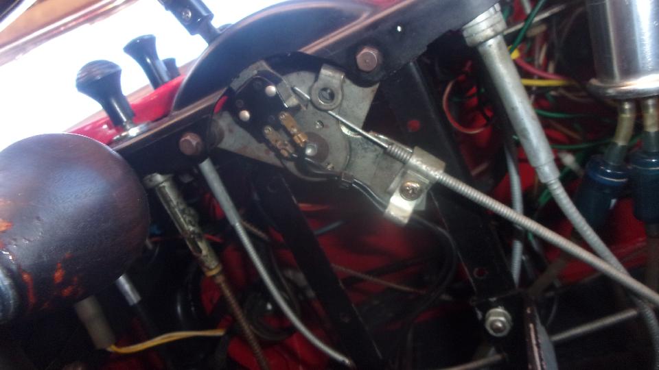 Approaching mid day we took another look under the bonnet to find a wire broken, again. The ignition lamp connection wire to the alternator had broken at the Lucar connector end. Following the information from Kelvin Dodd at Moss Motors, I tried harder to fit a standard 1/4-inch female Lucar connector to the alternator spade terminal. First it didn't go, but after some prying open and pinching tighter and more fiddling I got it to fit. Looks like that terminal blade is thicker than usual with square corners. Then I reconnected the warning lamp wire, and also a short length of another wire in the same terminal so we would have a test lead connection point. Good move, because it would not charge with the standard warning light connected, but it would change with a 12-volt jumper from the ignition coil White supply terminal to the alternator lamp terminal, just with no functional warning light.
