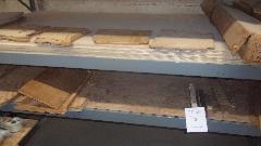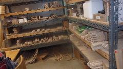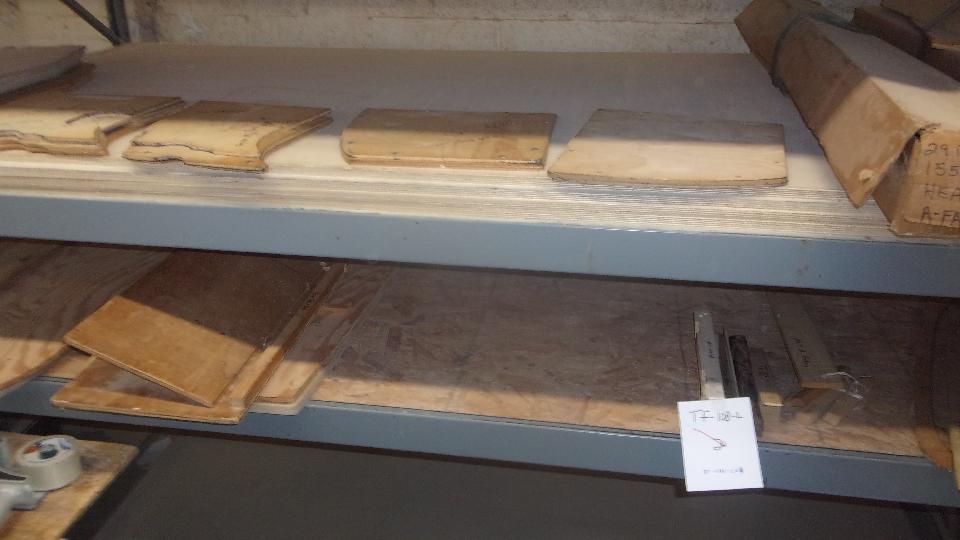 The little stack of wood parts below is his part number 090-535, a set of stop blocks (and tack strips) for the bottom of the seat back rests for standard MGA bucket seats (not Competition Deluxe seats). Next picture has MGA seat base boards on the lower level. And then stacks of MGA floor boards.