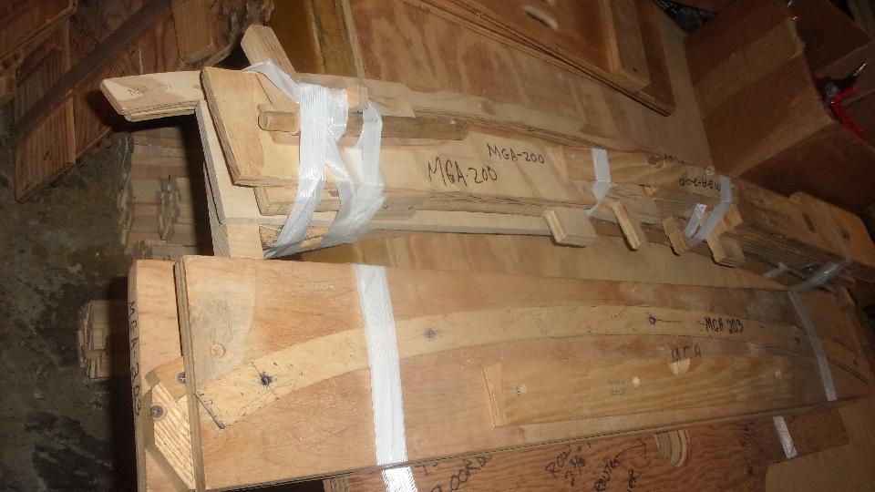 In the warehouse we found bundles being sets of wood parts for a complete car. First picture has most of the MG T-type wood parts. Second picture has an MGA full car wood set, and a smaller interior wood set with cockpit surround rails and rag top header rail. But not everything for the whole car yet.