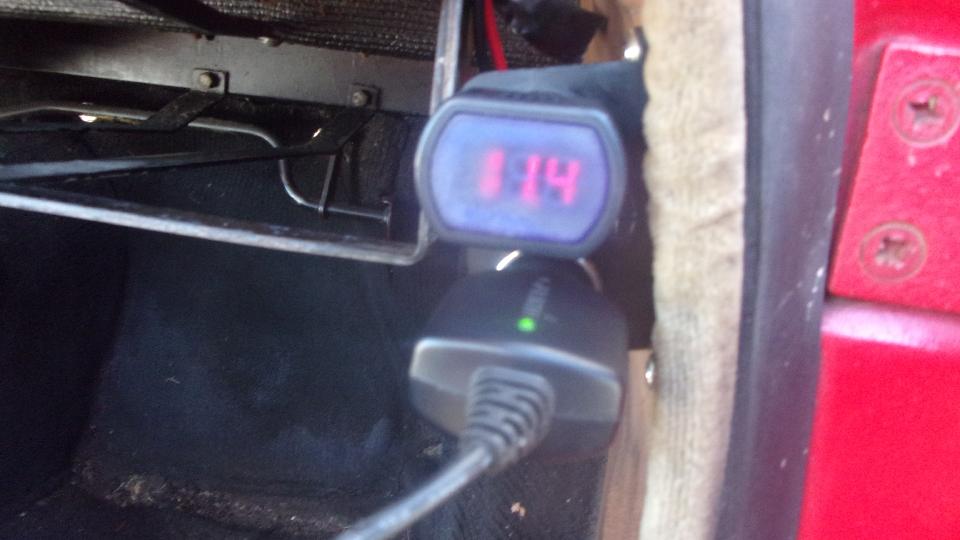 For our late night run the headlights were getting dim (oh-oh), and the cheap plug-in volt meter was dropping into the single digits (damn). Having just installed the new power jack, I was pretty sure that was okay. Then a couple LED illumination lamps on the dash flickered and went dark. I can take a hint. Fall in behind a truck, drop headlights from high to low beam, switch off all non-essential accessories, and figure we can make it several miles more to the next rest stop. Pull in, kill the lights, leave it running, get the DVM, and check voltage up front. Yeah, about 8 volts and not charging. No way I was going to shut it off with only 8-volts in the battery.