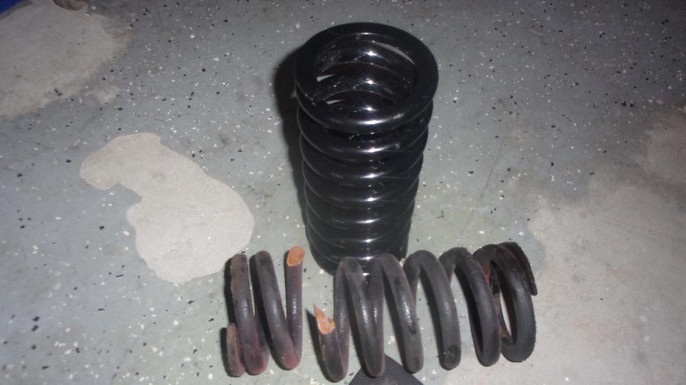 And then the free length, 9.00". Really? Only 1/8" extra. That was good news, and the supplier really didn't need any excuse for being out of spec. And hey, look what I found when I pulled the first spring out of the right front. I recon a broken spring would account for the abnormal front end sag we've had lately. Those were "good" used springs I installed less than two years ago when we had the last one broken. Maybe the coil springs only have a life expectancy of 60 years or so. Now glad that I bought new ones.