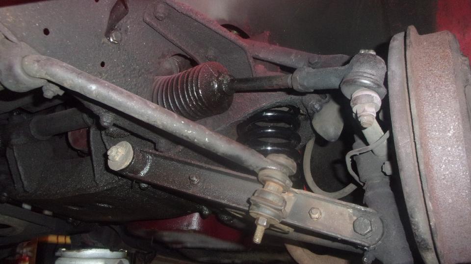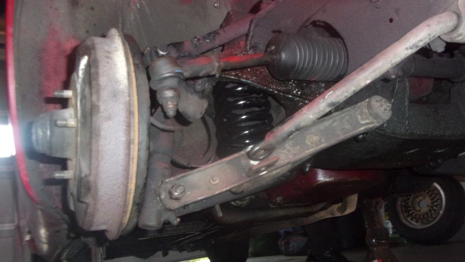 Okay, on with the job. Standard procedure. loosen lug nuts, jack up the front, place stands under the frame aft of the wheels lower the jack, and remove the wheels. Disconnect end links for the front sway bar. Place jack under the lower A-arm, directly under the coil spring, lift to get the upper A-arm away from the frame buffer, remove lower trunnion bolt, lower jack, push down lower A-arm to remove old spring and insert new spring. Lift A-arm with jack to re-install lower trunnion bolt (and be sure trunnion thrust plates and seals are properly back in place). Repeat on the other side, and reconnect the sway bar links.