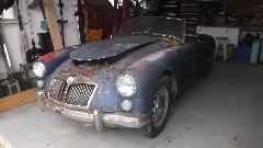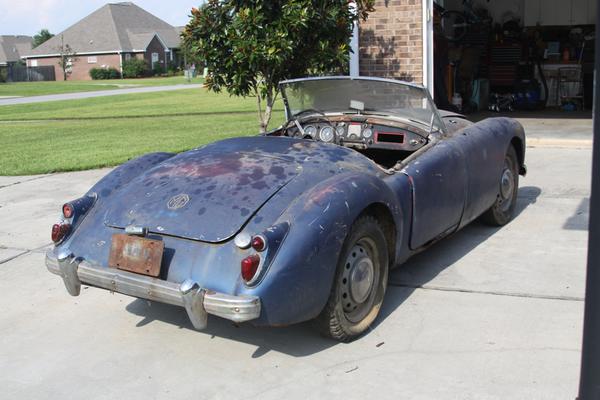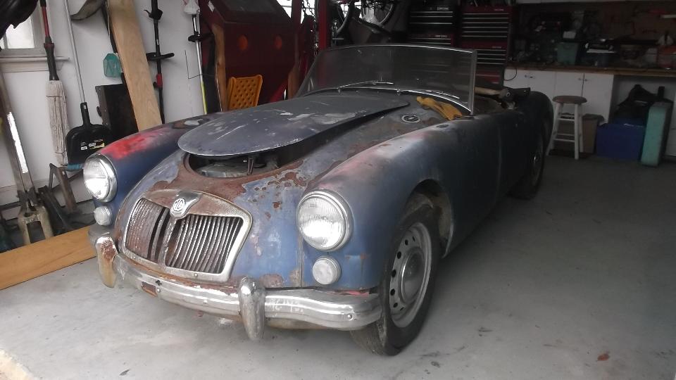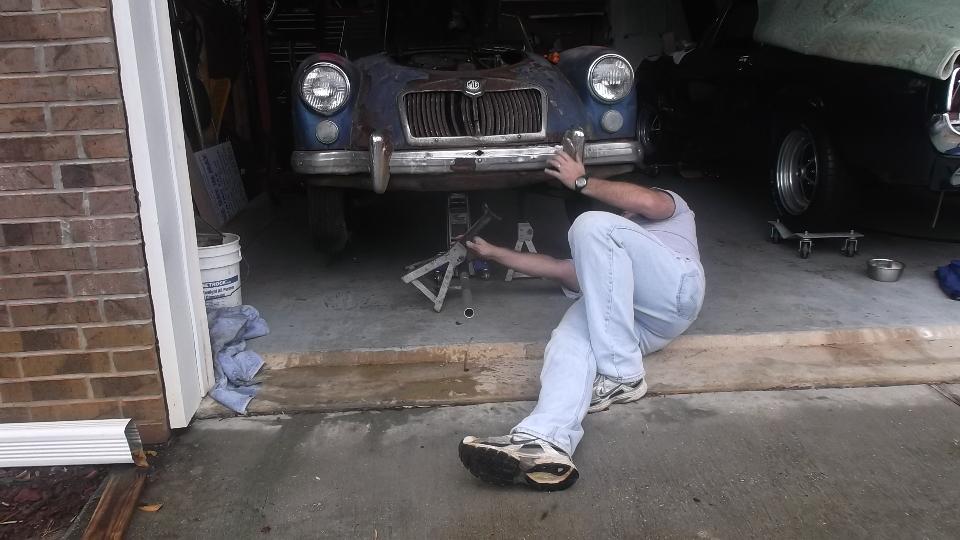 Special appointment today with Eric Baacke in Ocean Springs, Mississippi. We dropped in about 10-ish with a bit of drip and drizzle (which soon turned to warm and sunny). Primary task for today was to see if we could get the MGA's frozen engine to turn. The car rolls freely, so we put it in 4th gear an began to roll it to and from with great vigor. Engine was rocking and gears were clunking from the backlash, and finally the rear tires were skidding on the floor, but no joy, the engine wasn't turning.