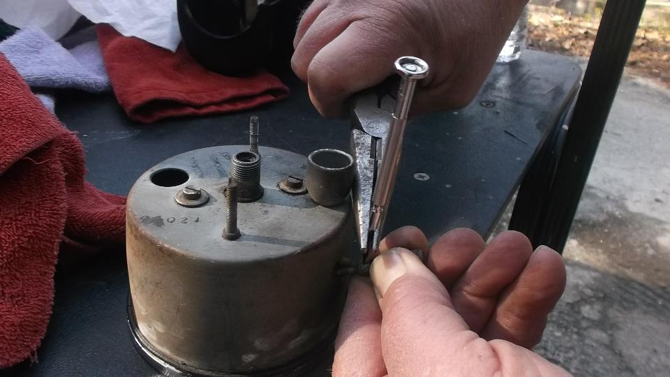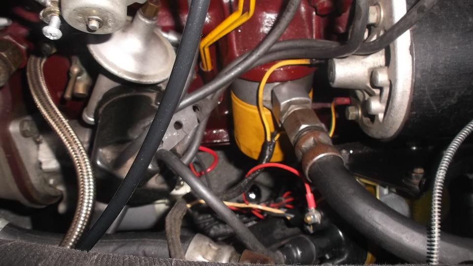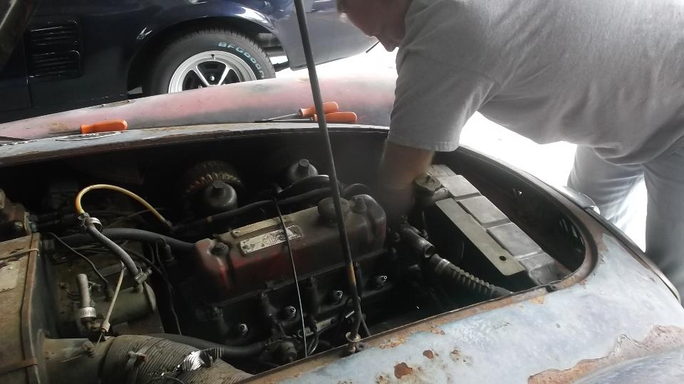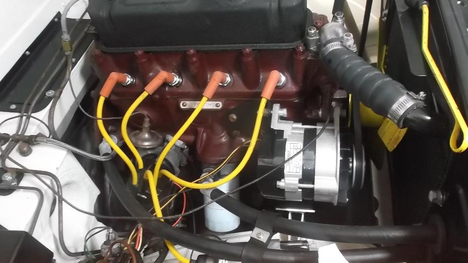 After grinding a small screwdriver to fit the distributor cap terminals, we cut the tail off of a couple of HT wires and reassembled it to get the wire resistance down, installed a new set of plugs, and checked the distributor cap for good internal posts. Also reset the valve lash after finding all rocker arms with too small gap. Then gave the Weber carb a quick mixture adjustment (very easy). Going after ignition timing, I set the timing by ear, then checked the results with a timing light, finding 24d BTDC. That sounds like a lot but it runs well.