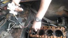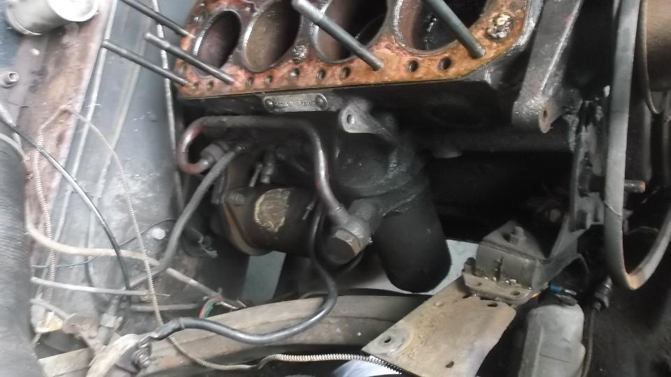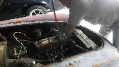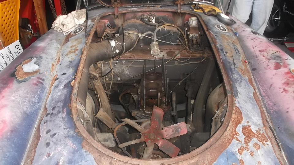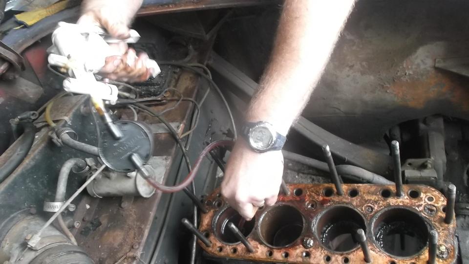 Radiator was already loose, and hoses were so rotten that they came off with one good pull, and the radiator was out of the way in a flash. Eric had filled the cylinders with ATF some months ago. When we removed the cylinder head for internal inspection every bit of the fluid was still there, right to top of the bores, so nothing had gotten down to the piston walls. Vacuum bleeder made quick work of removing the ATF.