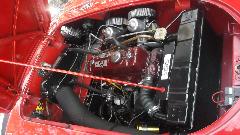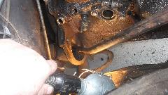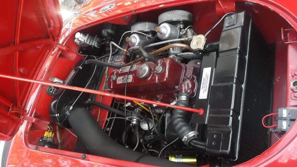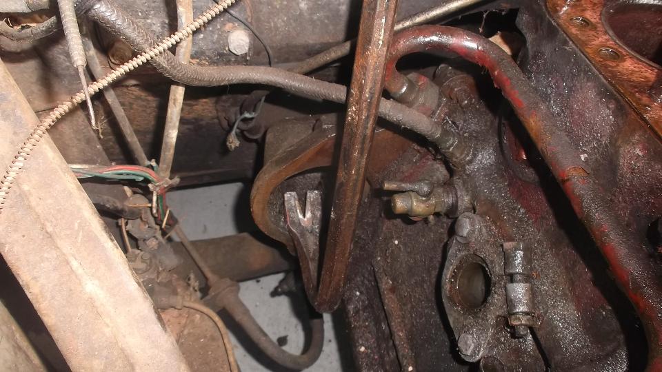 Near days end it was noted that the resident red MGA had a substantial oil leak while idling, something like a fluid ounce of oil every 10 minutes, which appeared to originate somewhere near the oil filter. After mopping up and wiping dry everything in the vicinity, it was disclosed to be leaking at or very close to the oil cooler hose crimp fitting nearest to the oil filter connection. Having old looking hoses with unknown history, it as decided to order two (original type) hoses for replacement to assure reliable future function.