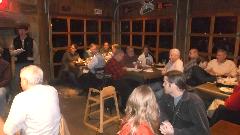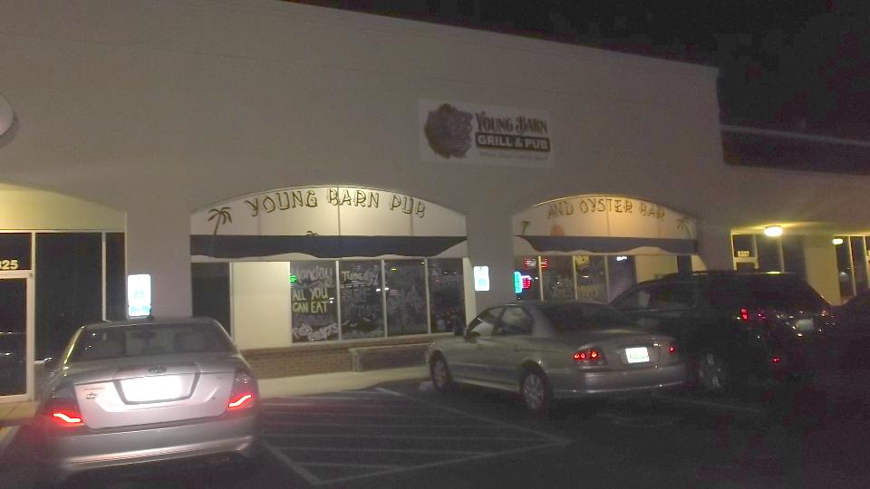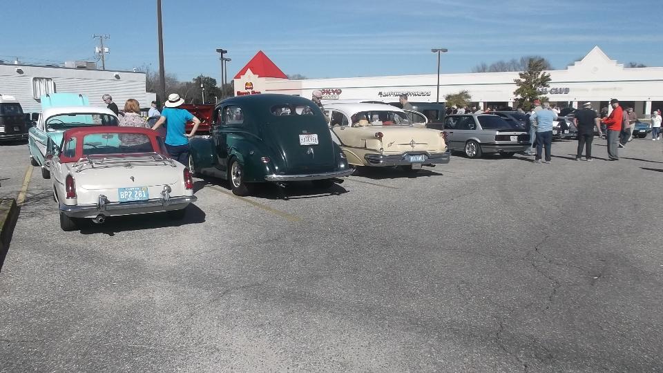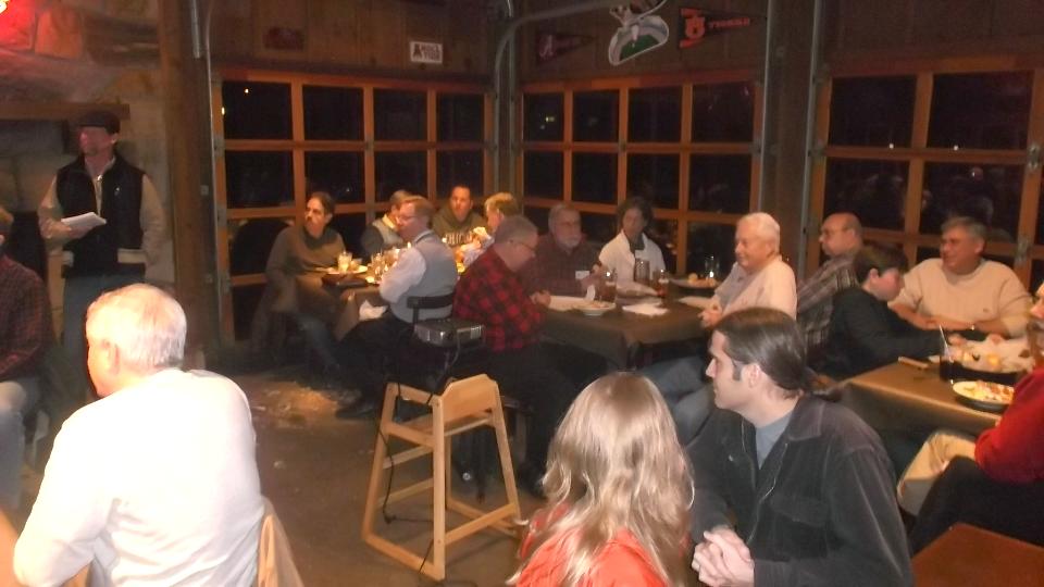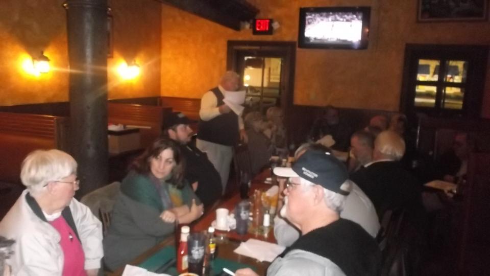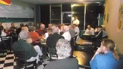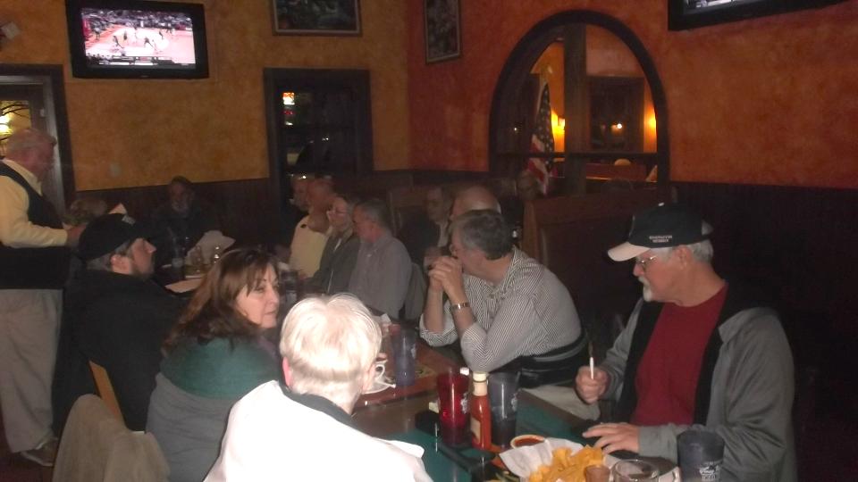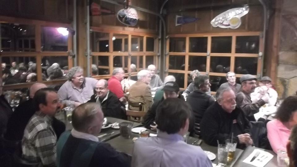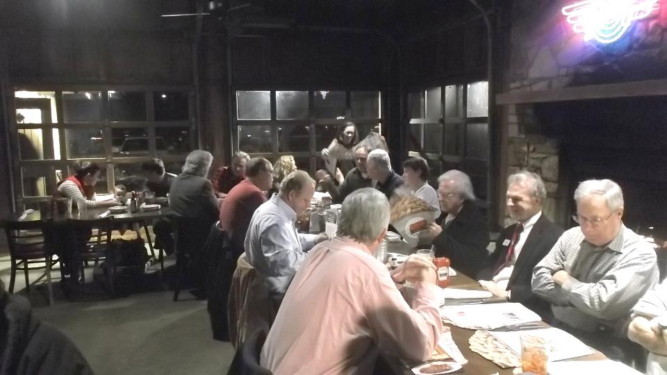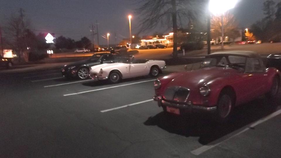 Tonight we dropped into the club meeting for British Motoring Club of Montgomery, Alabama, with about 30 people in attendance. You may recall we were on tour with this group on January 24. We had a bit of trouble finding Young Barn Pub & Oyster Bar in a strip mall on a side street from a side street, arriving late for dinner but in plenty of time for the business meeting. Being our second visit, they made us honorary members and gave us a club sticker (which we may paste somewhere on the car). Selection of British cars present was a bit sparse, but there was another MGA and a new Mini.