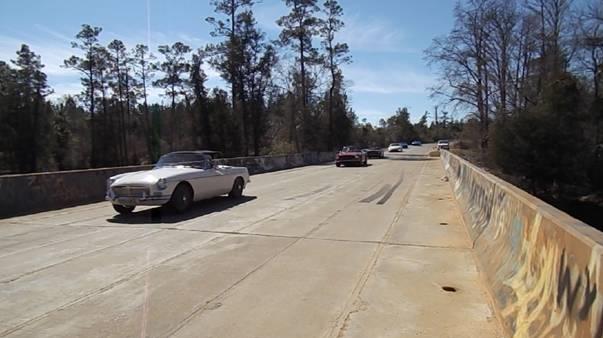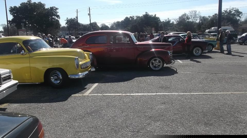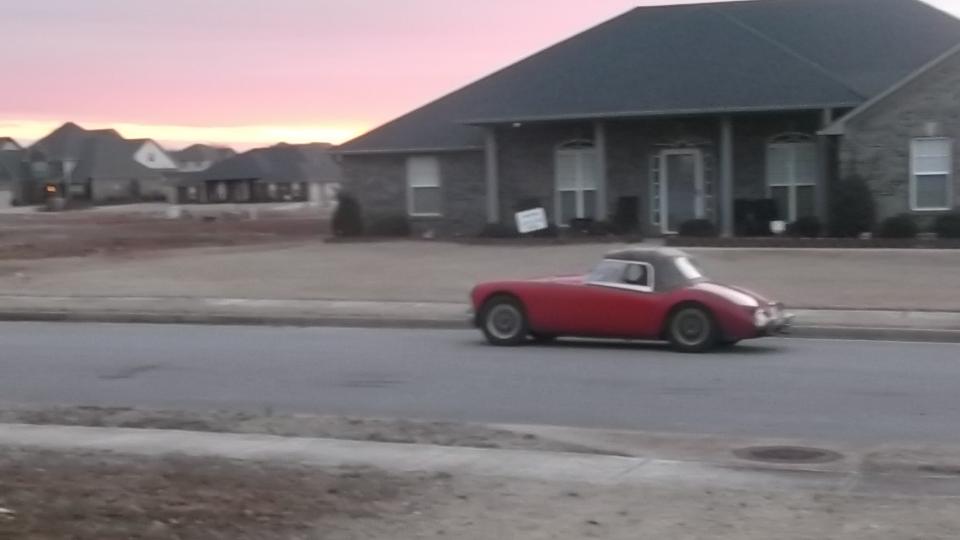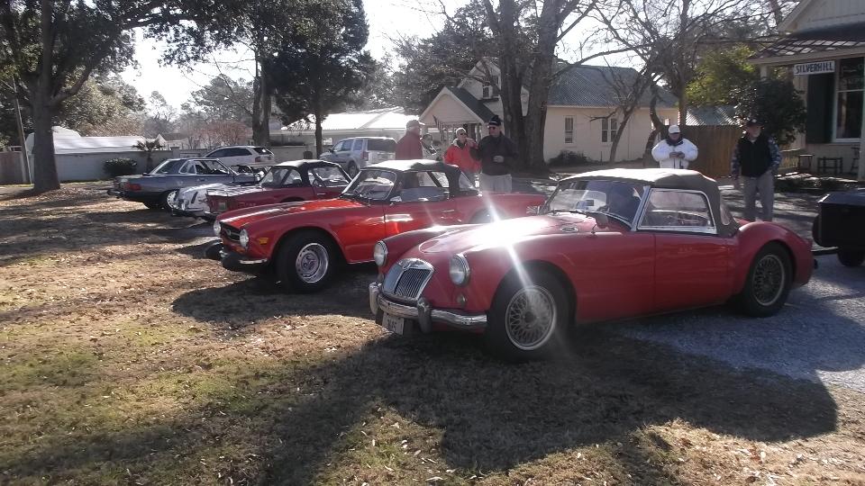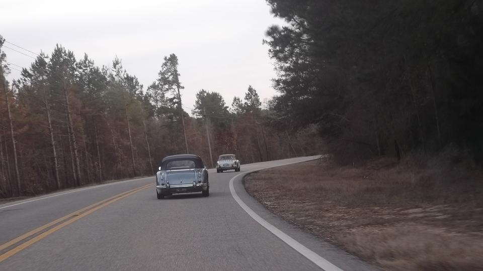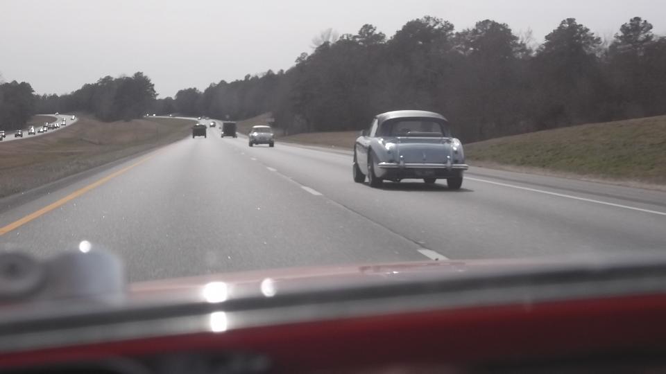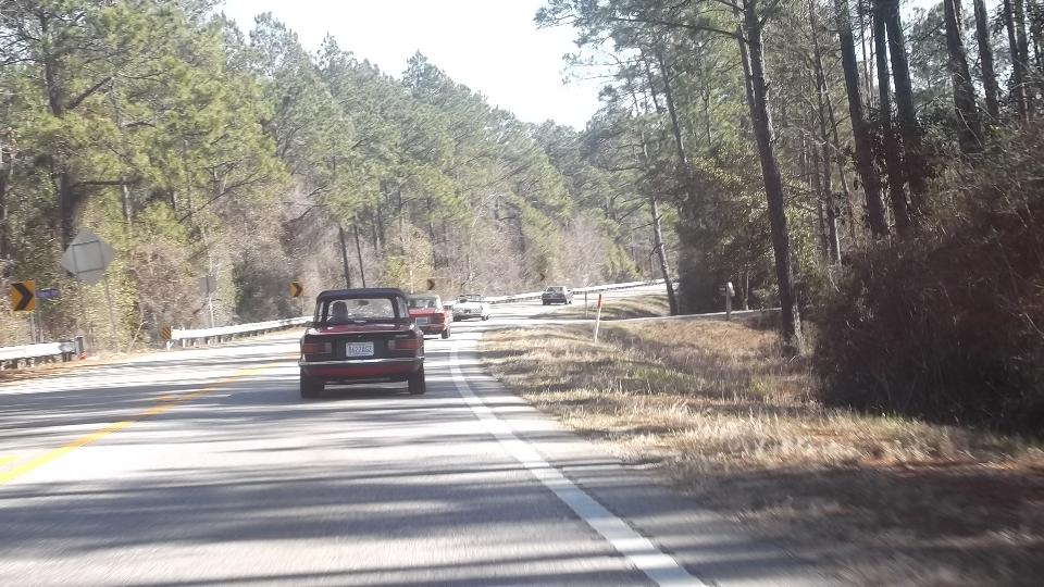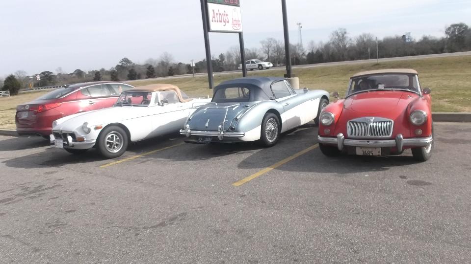 Time to hit the road again. This morning in Madison, Alabama, the cup of soda in the door pocket was frozen, and the engine with 20W50 oil was sort of slow cranking. But eventually it fired up, and we were off at 8-am sharp. 190 miles down the expressway in less than three hours put us in Montgomery (again) with two hours to spare. Had to make a call to my bank first, then grab lunch and answer some email. At 12:50-pm we join some cars from British Motoring Club of Montgomery who are heading down to the Gulf coast for Fairhope Mardi Gras Parade. Count one MGB, one AH 3000, one MGA, one retro T-Bird, and a couple of sport utes.