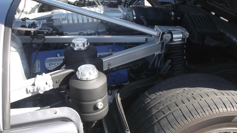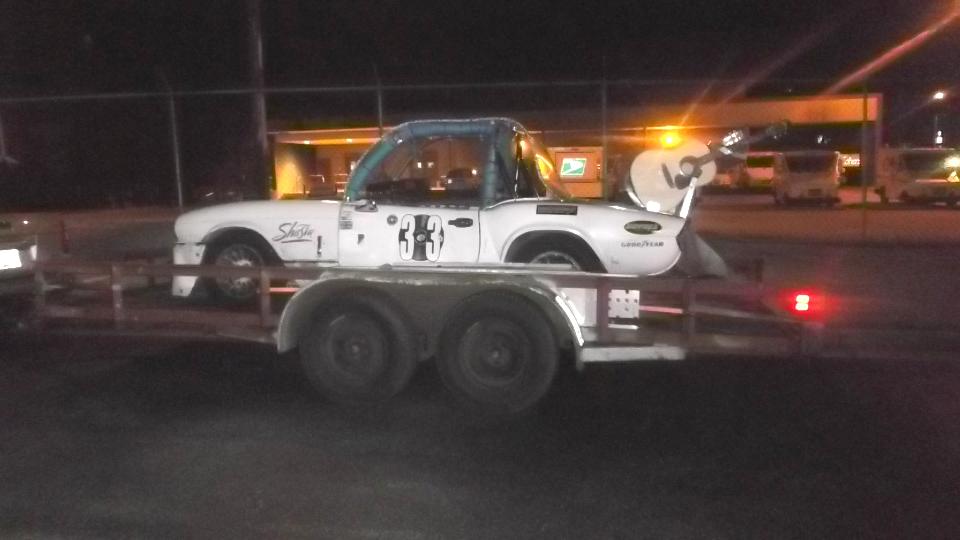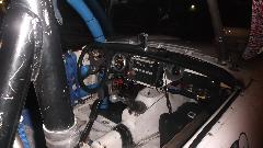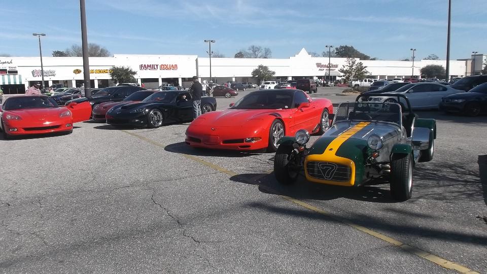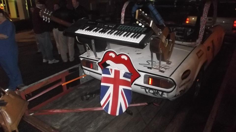 After the meeting a substantial part of the group reassembled in the parking lot to ogle the club sponsored survivor (sort of survived) of the 24 Hours of LeMONS "race", Feb 7-8 at Barber Motorsports Park at Birmingham, AL. This is s Triumph Spitfire with nearly stock mechanicals, and a bit of eclectic trim. Rules for the race cars limit investment in the drive train to $500 maximum, but you can spend any amount you like on "fuzzy dice" type of cosmetic trim. This one is sporting a pair of guitars and a functional keyboard piano instrument. The car raced two days, surviving nearly the whole race, ultimately breaking the crankshaft and destroying the engine block one hour before the end. But it finished third in class (as a lot of other cars broke earlier).