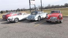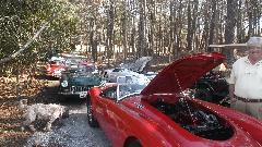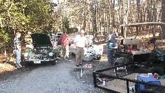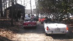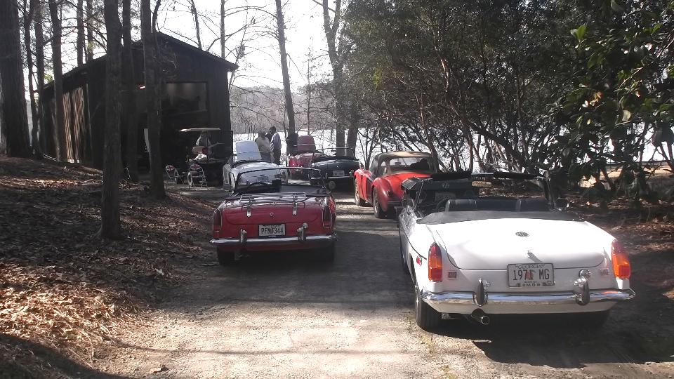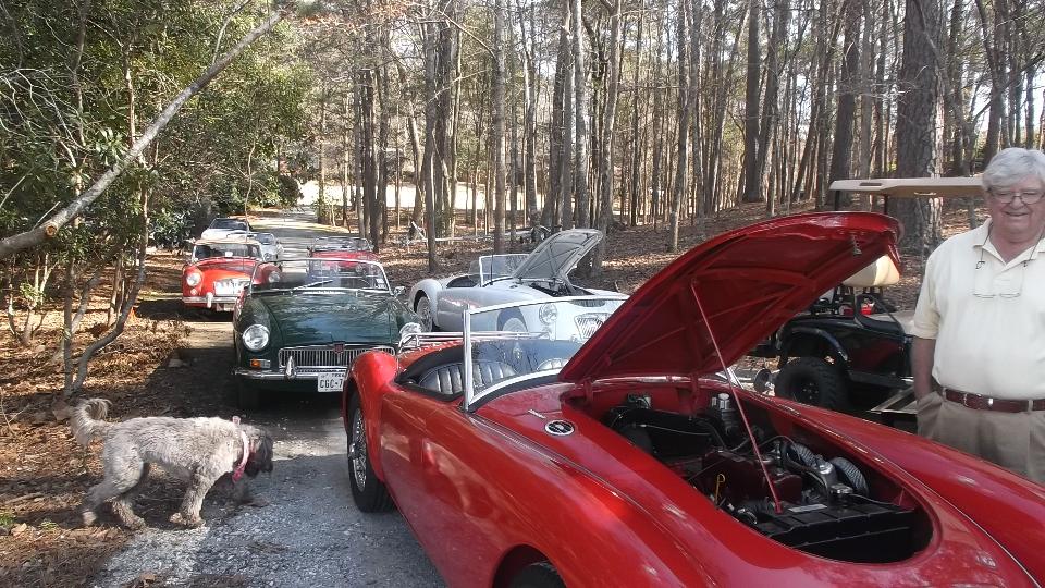 In attendance were yours truly Barney and Elliot Gaylord (red '58 MGA), Keith Farley (white '71 MGB), Keith Treadwell (white '60 MGA), Jim Walton (red '64 MGB), Brian Winter (green '65 MGB), Larry Stephens (red '62 MGA and E-type Coupe resident here), and Ray Mobley (Porsche 911). Ray also has a '65 MGB (and a pair of Volvo 144). Notably absent was Phillip Clark ('74 MGB and other Brit cars) who has the home shop on south side of Columbus). There are a few more members of this group not present today.