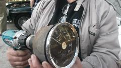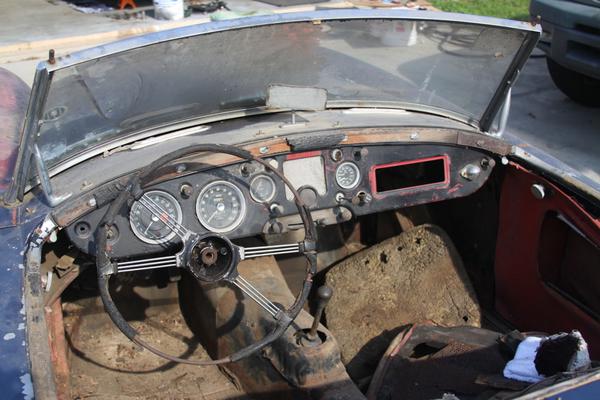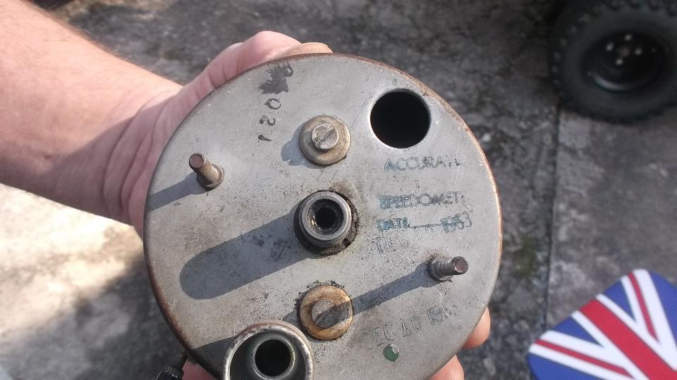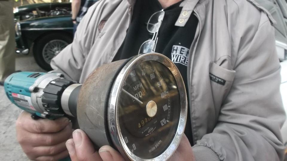 Lots was accomplished today. Each car that didn't have previous attention got a tune up, and there was plenty of discussion about the character and maintenance of little British cars. The white MGA got special attention to the speedometer with dual odometers none of which was working. Turning the input shaft gave no output at all, so the instrument was disassembled enough to get the works out of the case for inspection. The trip reset knob was removed (with certain prejudice) as well as trim ring and glass and light guard. Indicator needle was pulled from the shaft, face plate removed (two screws), and all was finally exposed. For both of the odometers the eccentric drive shaft was seized so the phenolic gears had sheared teeth (and we have no replacement parts handy). We were able to free up the indicator needle spindle with judicious application of aggressive solvents. In the end it was reassembled and shown to have working speedometer, which was a huge improvement for the shade tree effort.