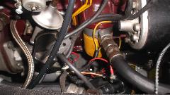This was fixed with a few turns of small wire for a hose clamp. With vacuum advance working, the set-back timing light revealed 53d BTDC at 4000 rpm with light throttle, or 21d as a result of the vacuum unit (very good results). After a nice test drive, the proof is in, just check the grin on the face of the driver.
