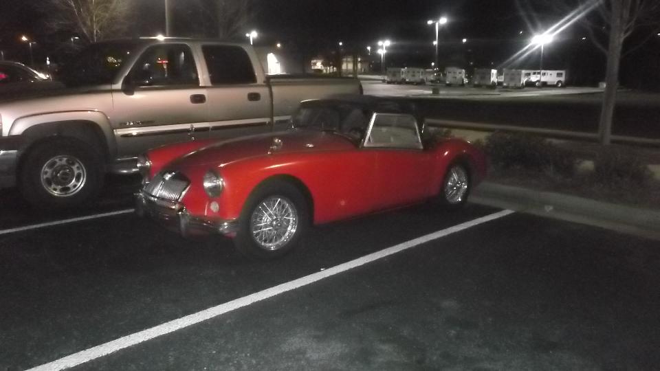 Say hello to North Alabama British Motoring Society with more than 40 people for a dinner meeting at Logans Roadhouse (possiby a new attendance record). After dinner and the normal club business meeting, we were called upon to do the pony show, explain the circumstances and purpose of our road trip, offer our services, and do a little promotion of my MGA Guru web site (playing Stump The Guru), and at least mention the Chicagoland MG Club. There was a short photo op (with half a dozen MGA owners), followed by a tire kicking session in the car park, and then we pointed it south and hit the road again. Say what?