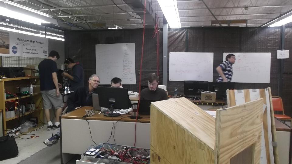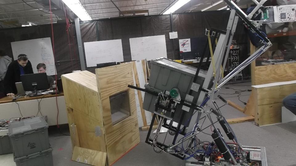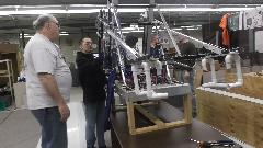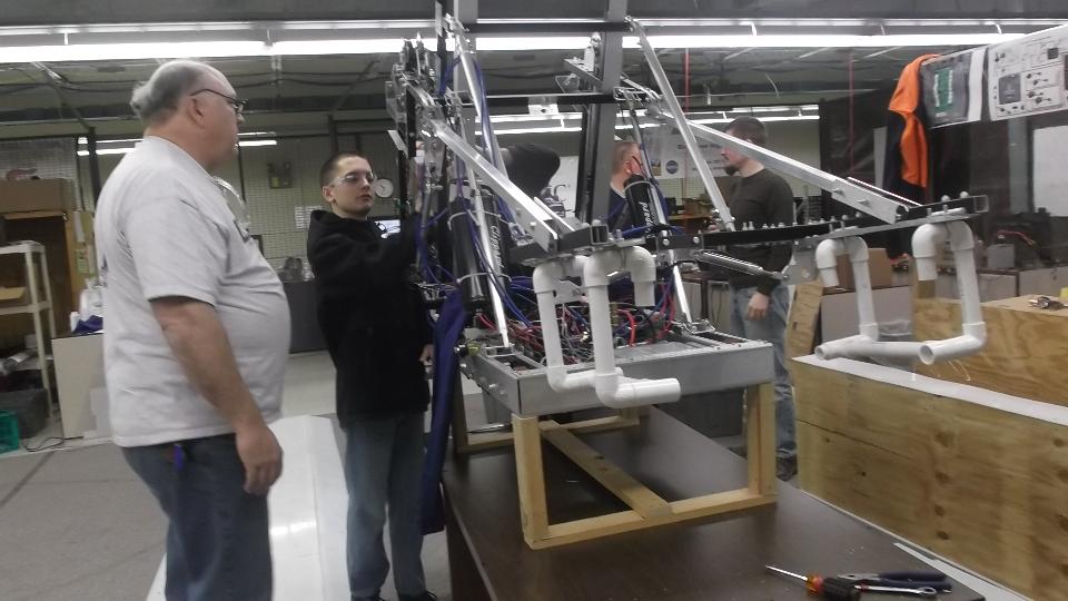 There was another trip to the high school robot shop today. I actually got to fettle a few pieces on the machine and make some suggestions (although they have plenty of professional guidance without me). The robot is supposed to snatch rectangular plastic bins, stack them at least four high and place a garbage can on top, as many stacks as possible within a time limit, while competing against other robots on the same floor space. Kicker is a limit of something like 68-inches on overall height of the robot, and a strict weight limit. This robot has a few fancy tricks up its sleeve.
