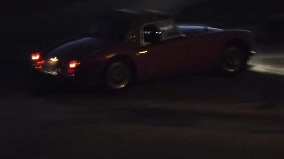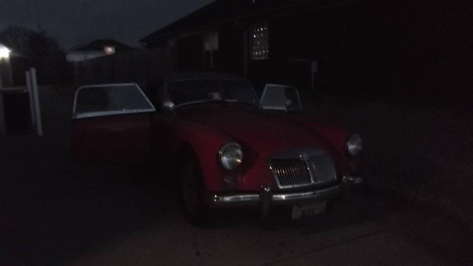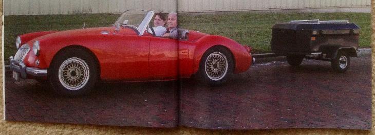In the evening Jim wanted to take his son Mark for a ride in the MG. Yeah, sure, going to be fun trying to squeeze those two guys into this car. Ah, but Jim has been there before. He drove this car around the mountains near Marietta, Ohio in 1988, and on the Indy track in 1989, and he had his own MGA to drive for some years. But of course the cars keep getting smaller every year. They did managed to get the doors shut, and they're off.