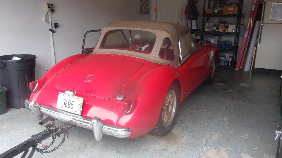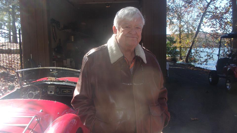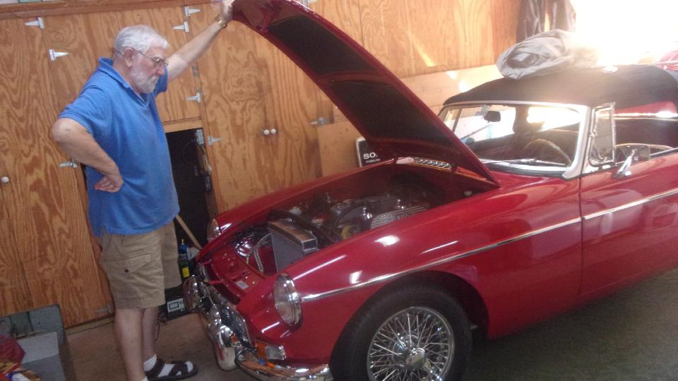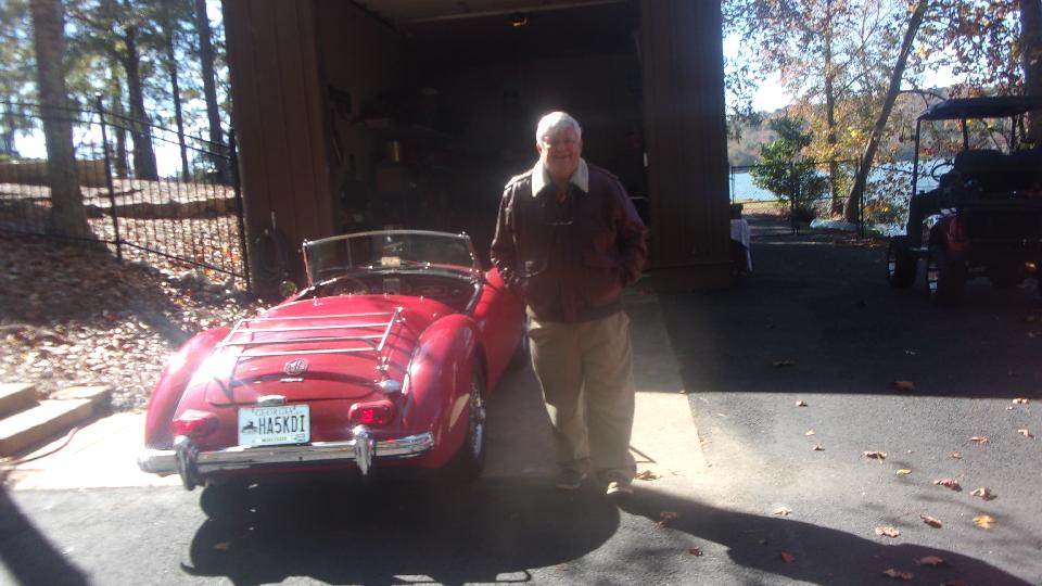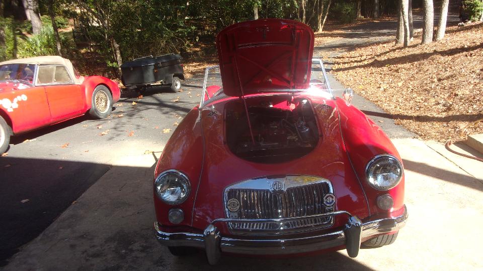 We had one more immediate appointment about 15 minutes away. Off to see Larry Stephens, "Way Down Yonder on the Chattahoochee" in Columbus, GA. He has (among other things) a very nice 1962 MGA 1600-MK-II that is very original and low mileage with no rust. It would be a champion "survivor car", except that it has been repainted once (from white to red). The first complaint was idling too fast, like 1500 rpm. That was a one minute fix, and the carburetors were otherwise in perfect tune (from the last time I touched it).