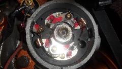 The test light dead, not blinking, meaning the points were permanently grounded, first oops. Pull the cap and rotor to poke around inside. Condenser is on outside, with the wires connected to the condenser and two contact points sets, so it was time to disconnect things to see what was shorting to ground. The leading points are on top in these pictures, trailing points on bottom. The shaft and cam turns clockwise, and you can see the points are 8-degrees out of phase, so the top ones open and close first, while bottom ones open and close last.
