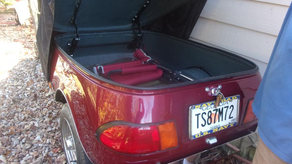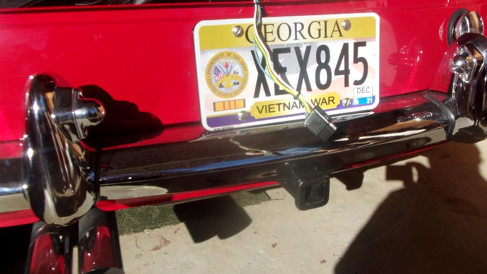 I was here because Carl had installed a trailer hitch on his MGB, and I wanted to see how he did it with a unibody car. The hitch receiver is welded to an angle iron base, 2-inches wide and 3-inches tall. This angle is curved by expanding the short leg slightly until the curvature matches the rear surface of the MGB body shell. inside the boot is a steel strap running across the car just above the structural box section of the shell. And there are multiple bolts through the strap and shell and angle to secure it all together and spread the load over a wide area of the body shell. I haven't done the mathematical analysis, and I'm pretty sure this is not a full Class-I tow hitch (at 2000 Lb towing capacity), but I'm also pretty sure it will serve quite well for the purpose of towing a small luggage trailer.