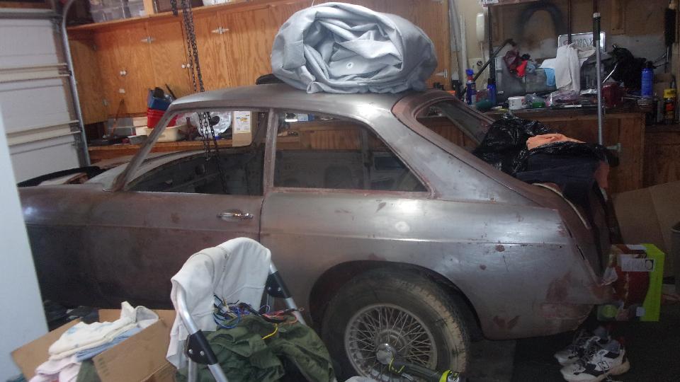 Since I was here anyway, I might as well have a look at the working end of the car. 1967 MGB, 1800 5-main bearing engine with a clean-up bore, slightly higher than stock compression ratio, and a fast street cam (mild upgrade cam). Behind this is a late model 4-synchro gearbox with overdrive, bit of a squeeze but it fits. Sharing the garage was Carl's next project, restoration of an MGB GT (with a long way to go on that one).