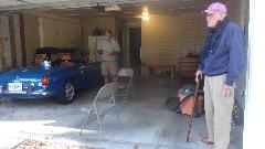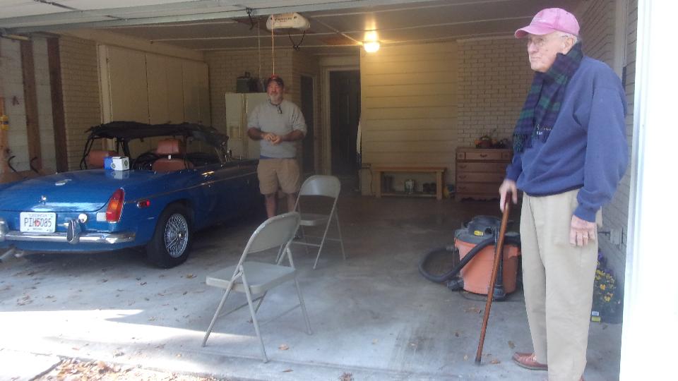 Up early for breakfast and reality check. Then off to visit Phillip Clark in Columbus, GA, not at the shop but at his home garage this time. that's Phil by the car, and Jim Walton up front. The problem child here is the 1972 MGB that cranks but does not start. It was running last time he drove it about 2 months earlier. Now the fuel pump clicks, CLACKS LOUDLY and does not stop ticking. Diagnostics first. Pull fuel hose off carburetors, no fuel flow. Pull hose off pump outlet, no fuel flow. Pull hose off pump inlet, finger over port, run pump, no suction. Put longer hose on the fuel filter outlet, blow back into tank, bubble, gurgle, no obstruction there. Okay, it has to be a failed fuel pump.
