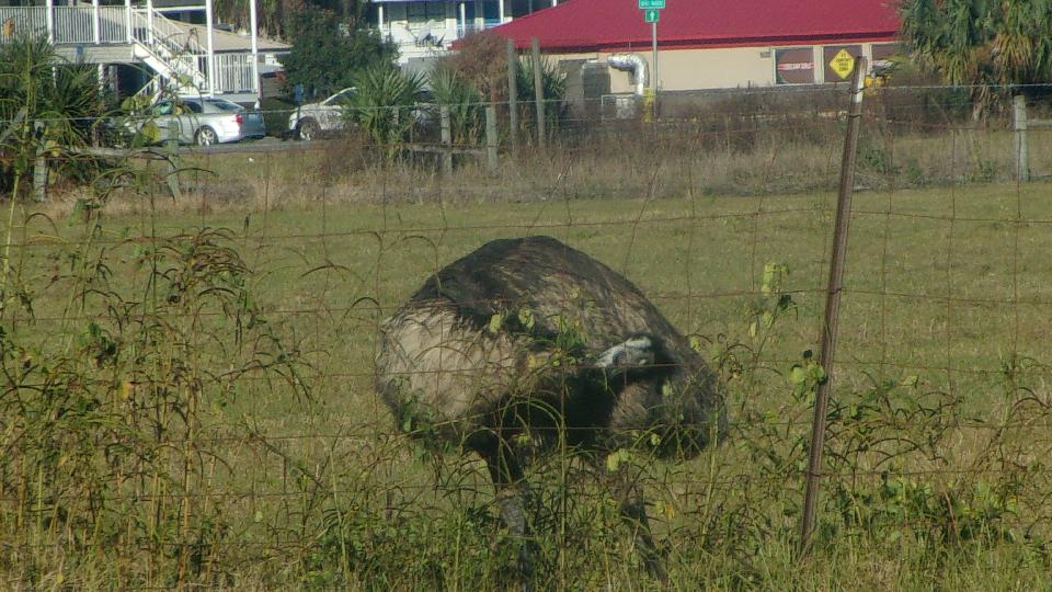 Morning hello to a friendly emu as we are moving east. Late breakfast in Live Oak, FL.
