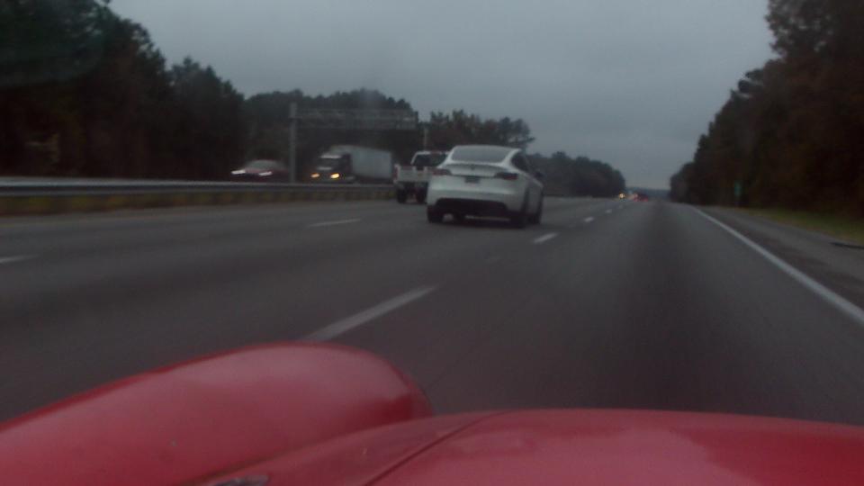 An increasingly more common occurrence this morning as two white Teslas passed us within two minutes. I happened to have the camera in my hand because the odometer was about to roll over zeros again. We stopped for breakfast before it did, so I may get another shot at it.