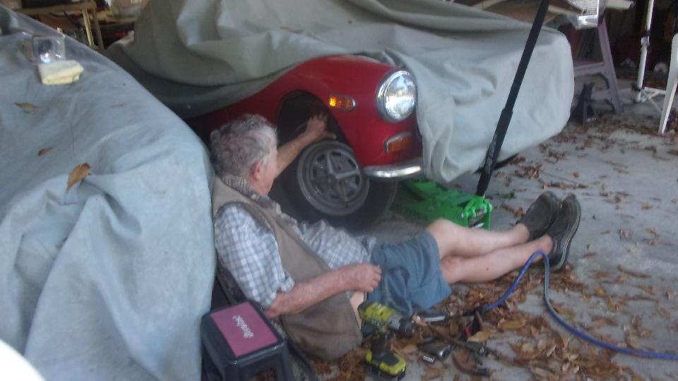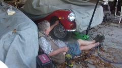 On arrival we found our friend working on n MG Midget, having just replaced a broken lug stud. He was a bit dejected to then find a broken wheel bearing, time out to order some parts.