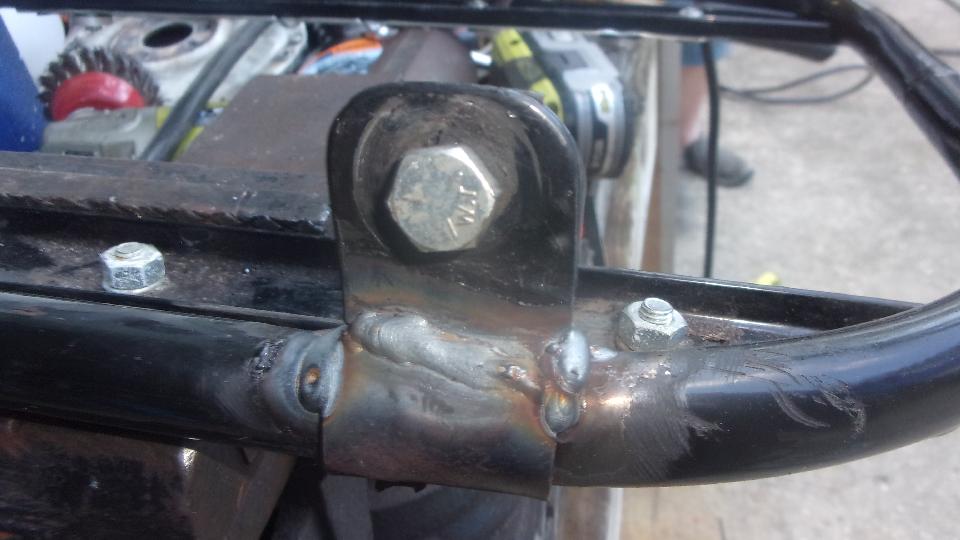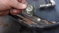 The bolt goes through the backrest bottom bracket first, then through a thin flat washer serving as a thrust bushing between the moving parts. Then through the clearance hole to be threaded into and through the last thin layer of the bracket before gentle tightening. Just eliminate any excess clearance, but leave it free to move. Finally install a hex nut to serve as a jam nut to make the bolt one with the fixed bracket. Then the bolt stands still while the seat backrest can hinge forward around the bolt. The more I think about this arrangement, the more I'm convinced that the bracket material is way too thin. I will have to check this against some original parts to see if the aftermarket supplier screwed up.