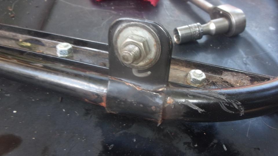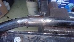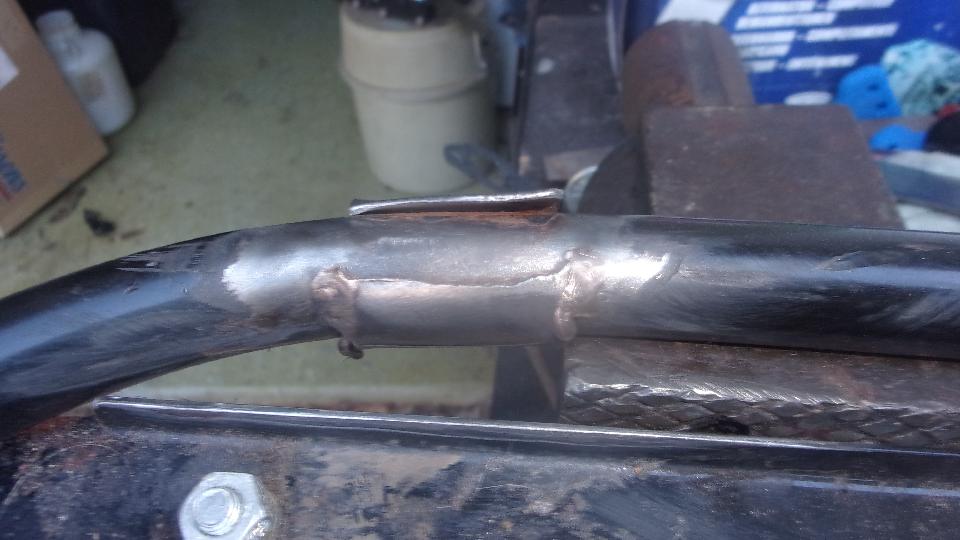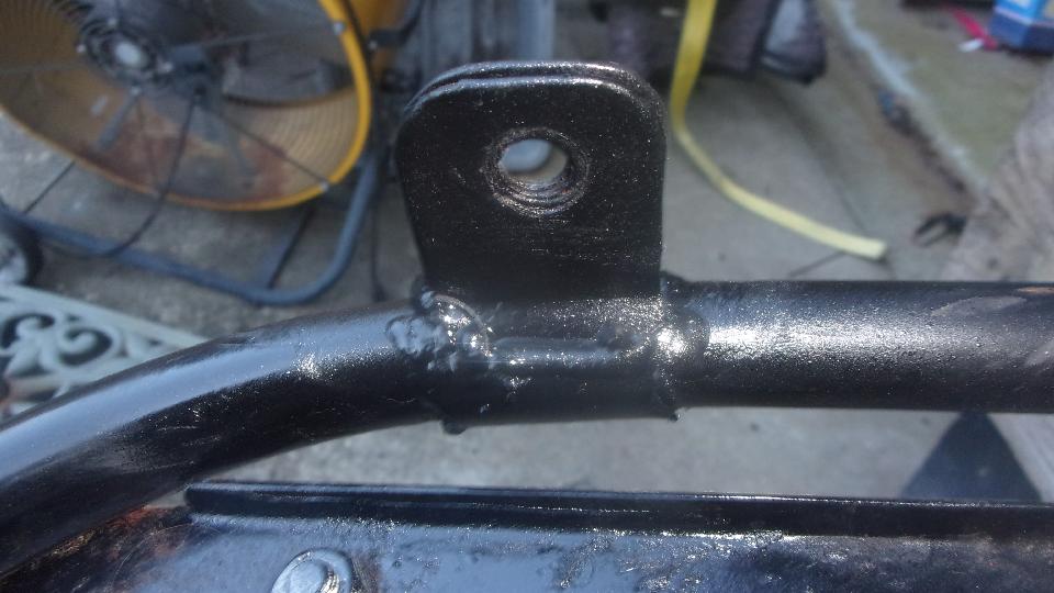 We noticed the parts were brazed together with brass rod. Really? Who brazes anything any more? A little hammering to beat the parts into reasonable mating shape, and weld them back in place (we hope a little better this time). Notice in the last picture with the paint applied, the one metal layer has a 5/16-24-UNF thread tapped through it, while the other layer has a clearance hole for the 5/16" bolt. Since the metal is only 0.060" thick, that makes only 1-1/2 turns of thread (and no lead-in chamfer), so be very careful not to strip it out.