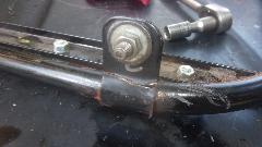 So we got to work on the broken seat, jacked up the left side of the car to remove four bolts underneath to remove the seat. Got the bolts out of the hinge brackets, power wire brushed away some powder coat paint (some of which was peeling off due to rest under the skin. I measured the metal thickness to find these brackets were made from 16-gauge sheet steel (only 0.060" or 1/16-inch thick. Even though it looks like double layer, that's still pretty thin for a structural hinge bracket.