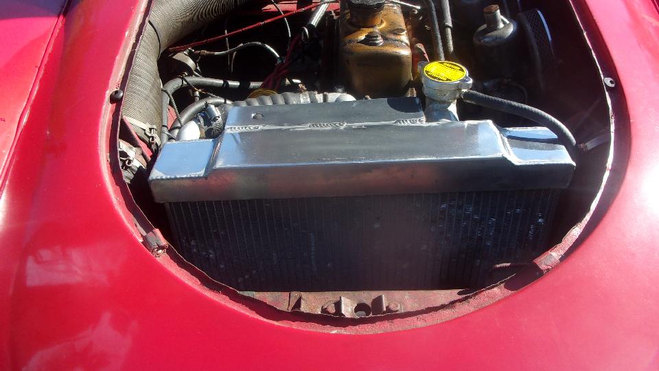 The Parish Plastics hardtop was a very nice fit with proper screw-down "eye" bolts in front and turnbuckles in back. The AMCO aftermarket side curtains were also an impressive good fit, nice and snug, quiet and mostly air tight all around. I was not much excited about the aluminum radiator, as I think an original cell core radiator will cool better, but this one was a Chinese made unit from Moss Motors, and it seems to fit well right out of the box and it works okay, so it's hard to criticize cheap if it works. We may get another visit with this one later.