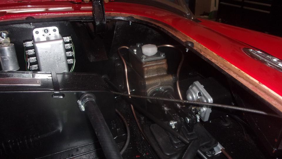 Then we got down to why we were here, checking out a clutch problem on the MGA. He thought it was an"over-center" problem where it would initially release, but then begin to re-engage and drag when the pedal was pushed farther down. Well, no, it was more like just not fully disengaging, not enough travel of the slave cylinder relative to the master cylinder, which means probably still having some air in the system. So we had some discussion about different (maybe better) bleeding techniques.