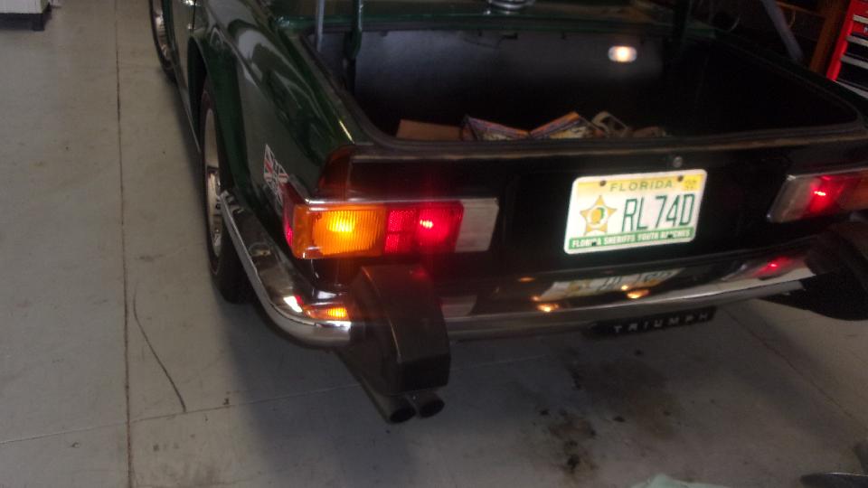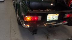 Then on to debugging electrical issues on the TR6. All front lights working, so reinstall the RF parking lamp lens. On the left rear, tail light goes out when brake is applied, turned out to be a corroded Lucar connection on a body grounding tab. Both rear turn signals not working, oddly enough turned out not to be related, but did have identical failure mode. The T/S bulb sockets ground to the metal lamp back shell via 8 or 10 spring fingers around the socket base. You might think the contact redundancy should make a reliable circuit ground, but you would be wrong. All 8 or 10 spring fingers on each T/S bulb socket were corroded enough to fail connection to the lamp back shell. Yep, maybe 20 spring finger contacts all failed at the same time. So a bunch of twisting and jiggling finally cleaned them up enough to get reliable ground connections. Subsequent testing of the turn signals for at least 10 minutes straight could not make them fail, so call it good and reinstall the interior cardboard cover panels in the boot.