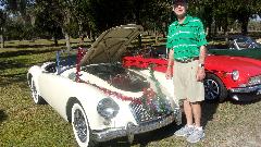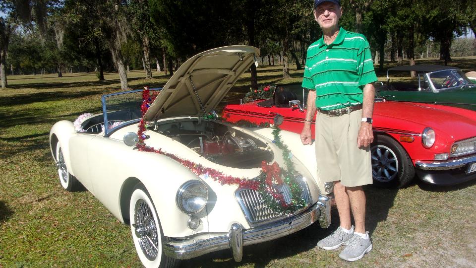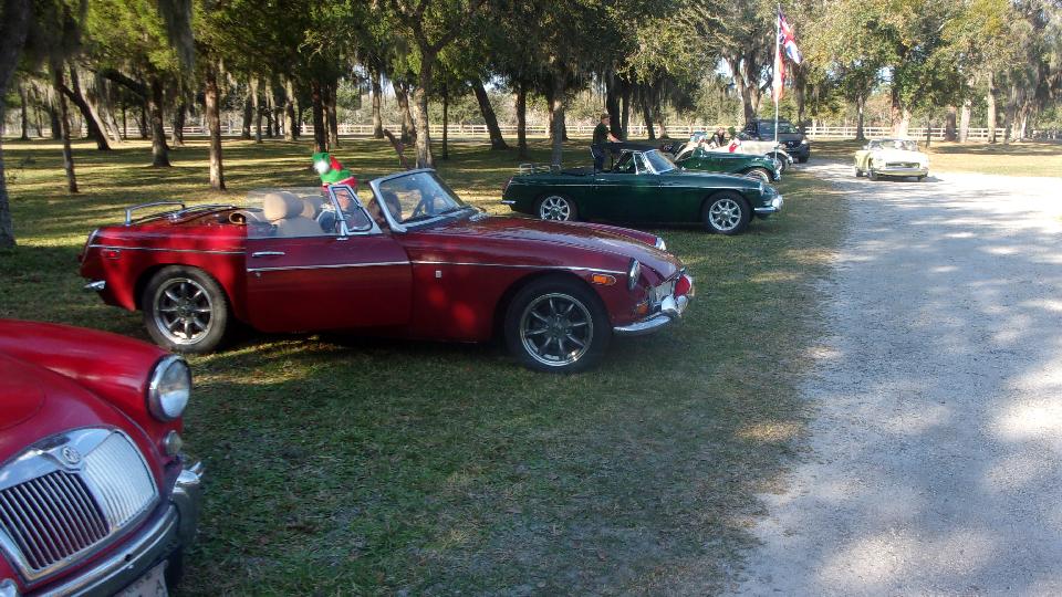 One tech question about a dead alternator in the morning, and then it was Party time with MG Classics of Jacksonville holiday party in St. Augustine, FL. We popped in on time right at noon, then got distracted before even getting a picture of all the nicely decorated cars lined up, This white MGA belonging to Tony Kimball from Jacksonville, FL was cooking the driver when the heater wouldn't shut off. That was just a missing cable stop at the water valve leaving the control cable disconnected. The Magic Trailer had the spare part, so we had that reconnected in short order.