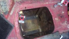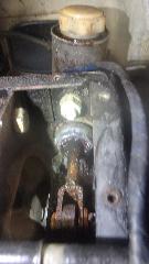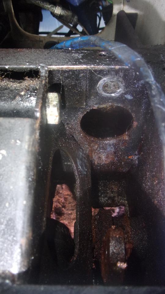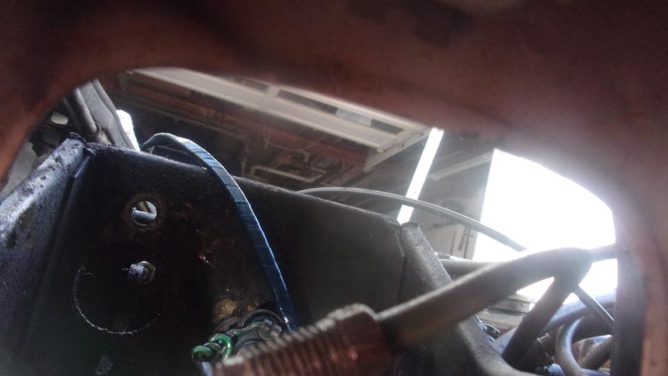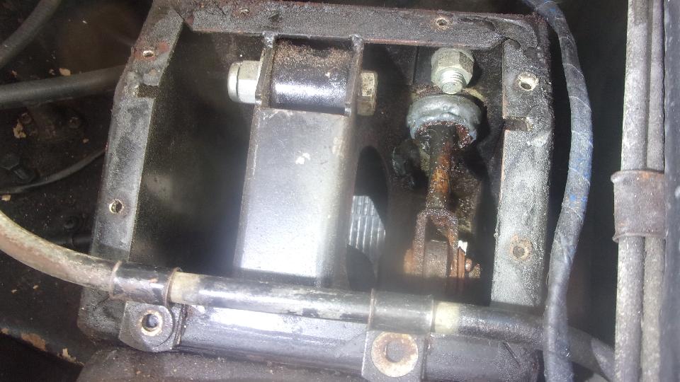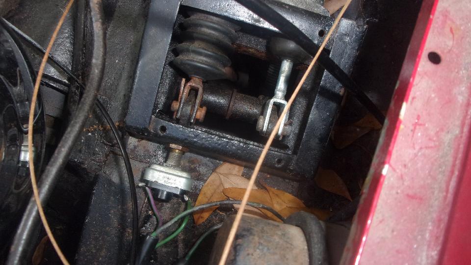 Remove cover from pedal box to reveal leaking clutch slave cylinder. Should be an easy replacement? Remove rusted cotter pin, washer, clevis pin, Disconnect pipe from rear of cylinder (in very tight quarters), and remove top mounting bolt (not bad up to that point). Then the real fun. Knock out the rubber plug in the bulkhead for rear access, and get in there with a socket and long extension and ratchet