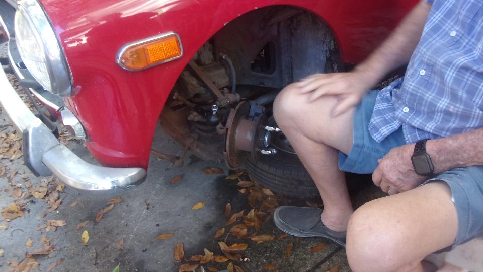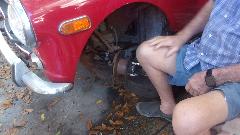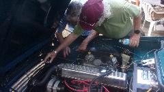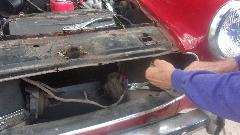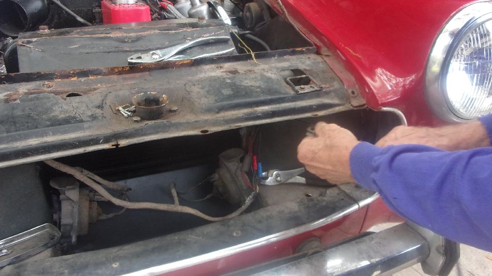 A few of the guys were working on the rusty Midget, just trying to get it driveable to get it out of here. Took a shortcut on fixing the broken center wire of the choke cable, just push the center wire of the new cable though the old cable jacket without taking it out of the car. Then after the rusted solid bonnet release cable, tough trying to get the old one out, so we just installed a short length of throttle cable to extend through the grill for an external pull release.