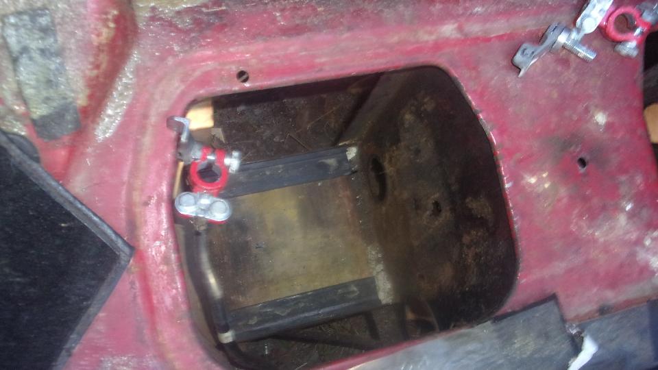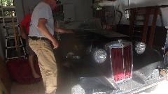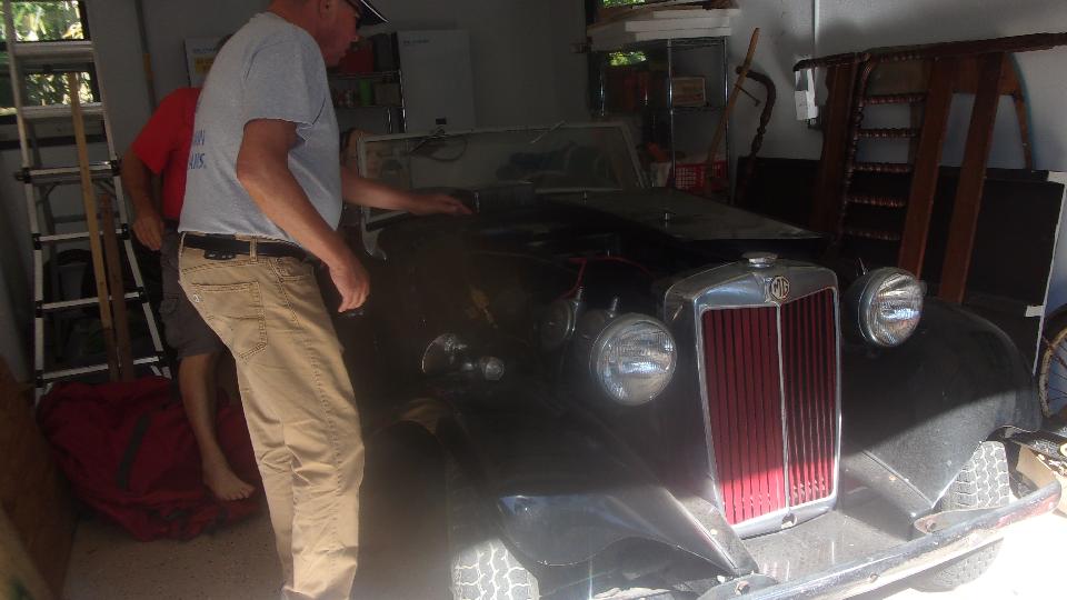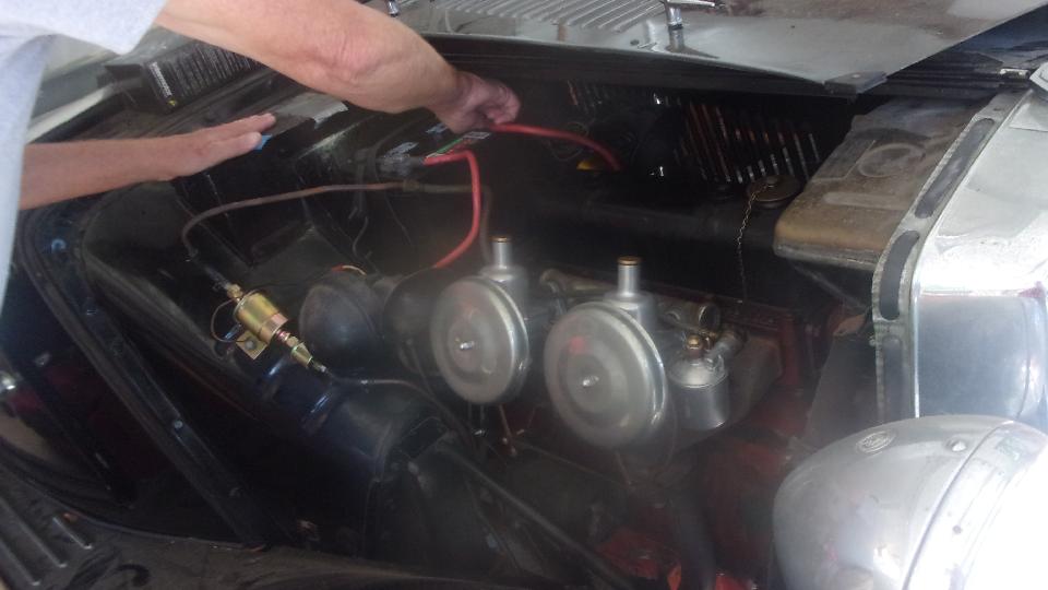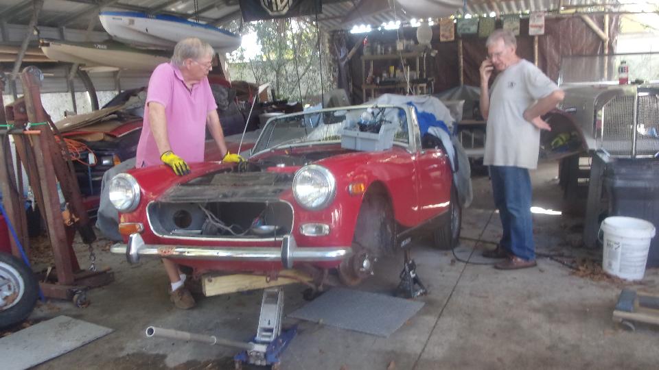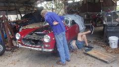 As we were finishing that up an early pull-handle MGB (all original) came in on a flat bed truck to install a new battery (a bit late after delay waiting for the truck). Fairly straight forward grunt work to rearrange cables to convert from twin 6's to a single 12-volt battery. Then Jerry followed the guy taking his family hauler home and brought him back to drive the MGB home (and we now have a happy new club member).