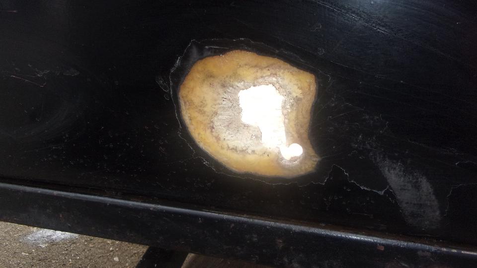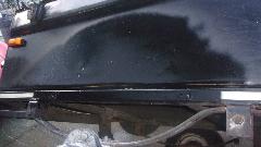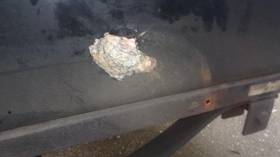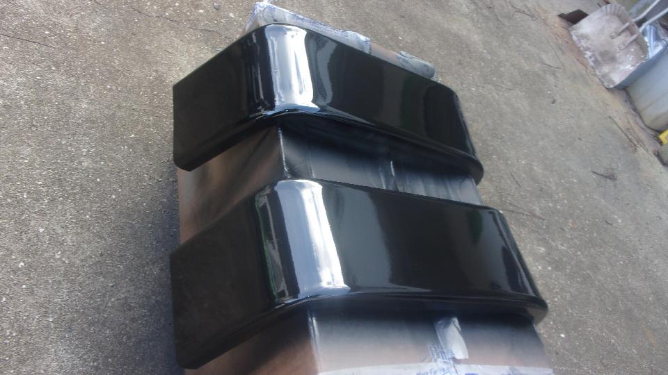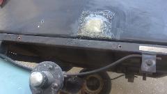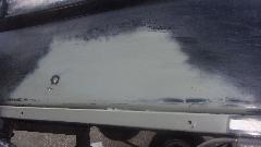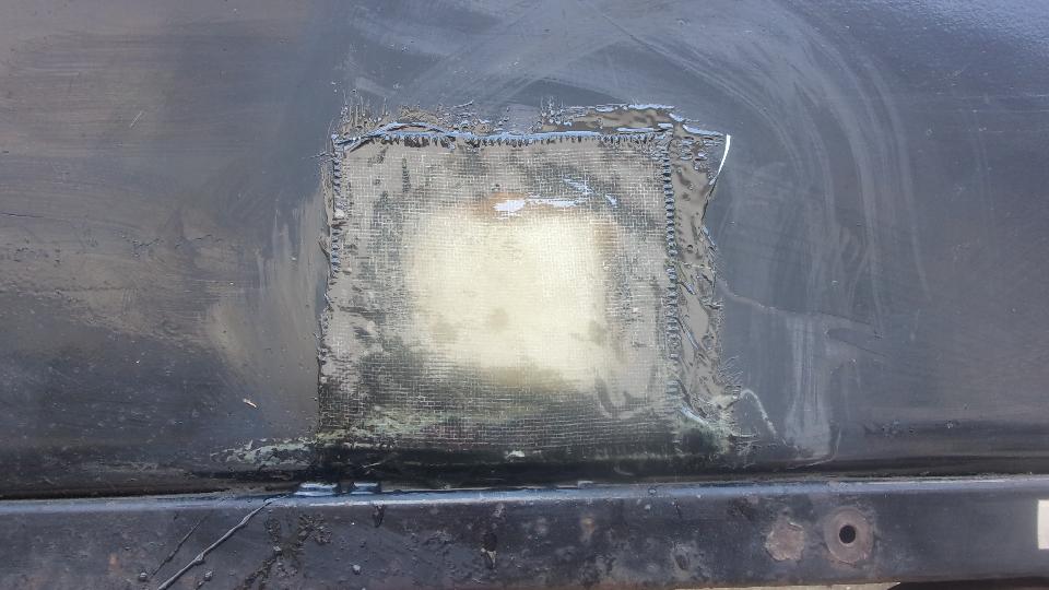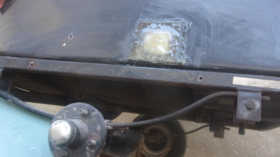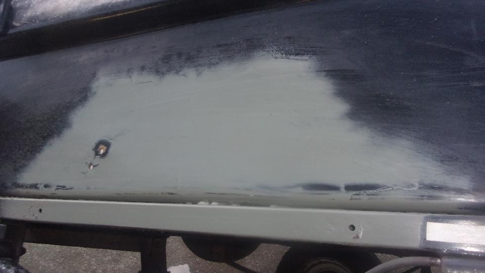 Hang in there a few hours, and I will get back with the rest of the story. --- Okay, back. Got lucky (or skillful), getting the fiberglass fill above the original outer surface. A few minutes with a sanding flap wheel on an angle grinder took it down to a slightly raised ripple. Five minutes wet sanding with 80-grit on a sanding block made it flat. A few minutes with 220 grit, and a few more minutes with 600 grit (didn't have 400 handy), looking good, Wash, rinse, towel try and air dry in short order, Just enough primer to be opaque, left 45 minutes to dry. A quick once over with wet 600 to evict bugs and dust, Wash, rinse, dry, and give it a black coat. If it looks wet, that's because it is.