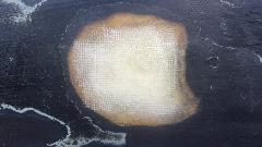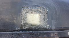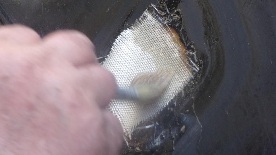 It didn't look like too big a hole at first, but after grinding away all of the loose delaminated debris it left a crater a few inches wide. Start by taping a piece of thin smooth cardboard flush on the inside surface. Then the process is to start with small square clippings of fiberglass cloth to be "painted" into place with catalyzed plastic resin. Add layer after layer of cloth of progressively larger sizes to fill the entire hole up to be flush. This is a pretty thick random mat fiberglass box, so it needed maybe 30 to 40 layers of cloth to fill up the full depth.