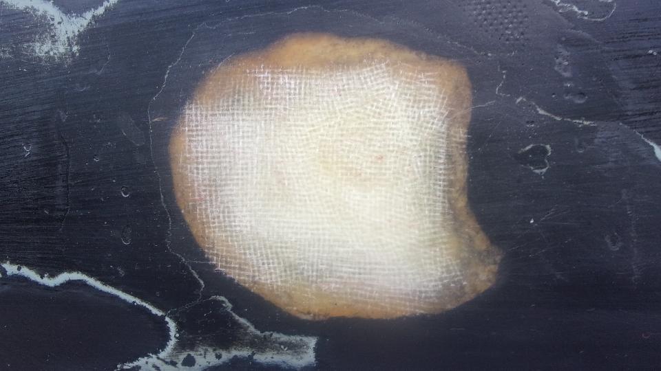 The final patch is a single layer of cloth on the outside to cover everything and hold it all together like a band-aid. The we get a lunch break for a few hours while it will set up hard enough for sanding flat. Kind of nice to take a WiFi break in mid day to post these photos and notes.