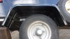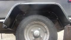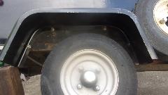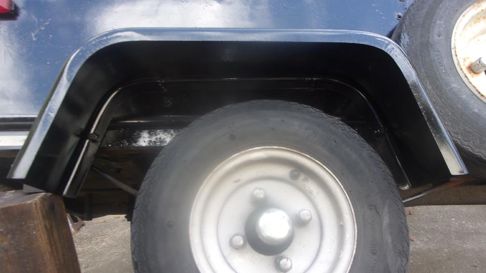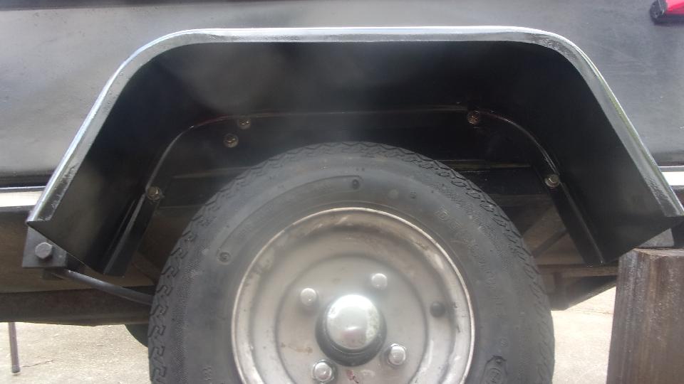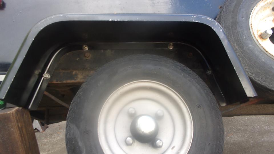 First picture below is left side, four bolts in the flange, and one hole plug bolt upper left not in the flange. When the original fiberglass fenders were replaced with steel fenders in late 1997, the new wings were installed an inch higher to allow installation of larger tires which it was wearing for one tire cycle. There is now space for 5.60x8 tires rather than the traditional 4.80x8, but have never again installed the larger tires, mainly a matter of cost, but also rear view sight line over top of the trailer. Second picture is right side, and please forgive the fact that this fender is about 2-inches farther back, not centered over the wheel. That happened with the change from the original smaller fiberglass wings to the larger steel wings, allowing for space occupied by the already present spare wheel on the right side. There are two rusty plug bolts in there, hard to see the one in far upper right. Third picture is an example of what happens when you spray a little more black paint inside to make the bolts disappear.