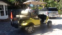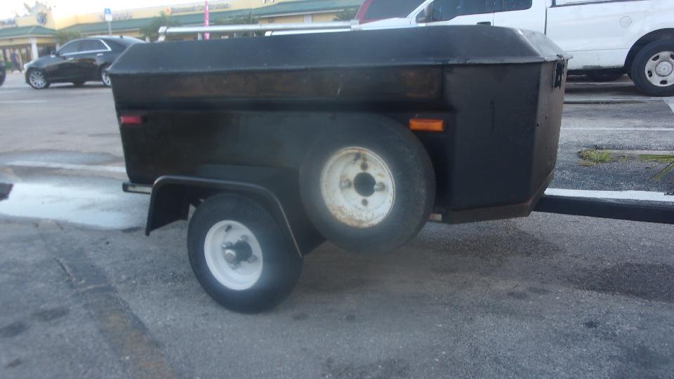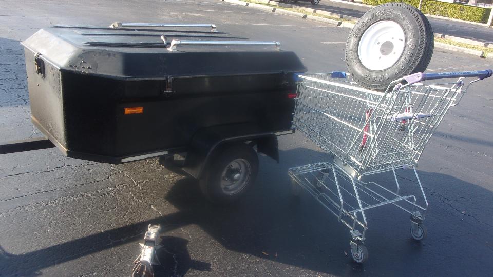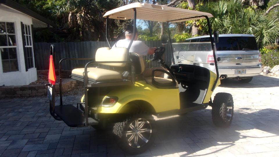 Not finished yet. Off to Harbor Freight Tools to treat us to a new set of tires (and wheels). Primary reason for buying new tire and wheel assembly is cost $40 (and very easy), while tires alone are about $20 each (on line). But last time around I got suckered into buying Load Range C tires (rather than B), and the tire sidewalls are so stiff that it took two men and a mule to get them onto the wheels. I didn't feel like having to pry them off or cut them off, so this was an easy way out. No more LR-C ever, please. Scissors jack and lug wrench, and in 10 minutes it was on and ready to go. The first HFT store in Bonita Springs only had one tire, so 20 miles up the road to another HFT in Fort Myers to get the second one. We were going that direction anyway so no problem.