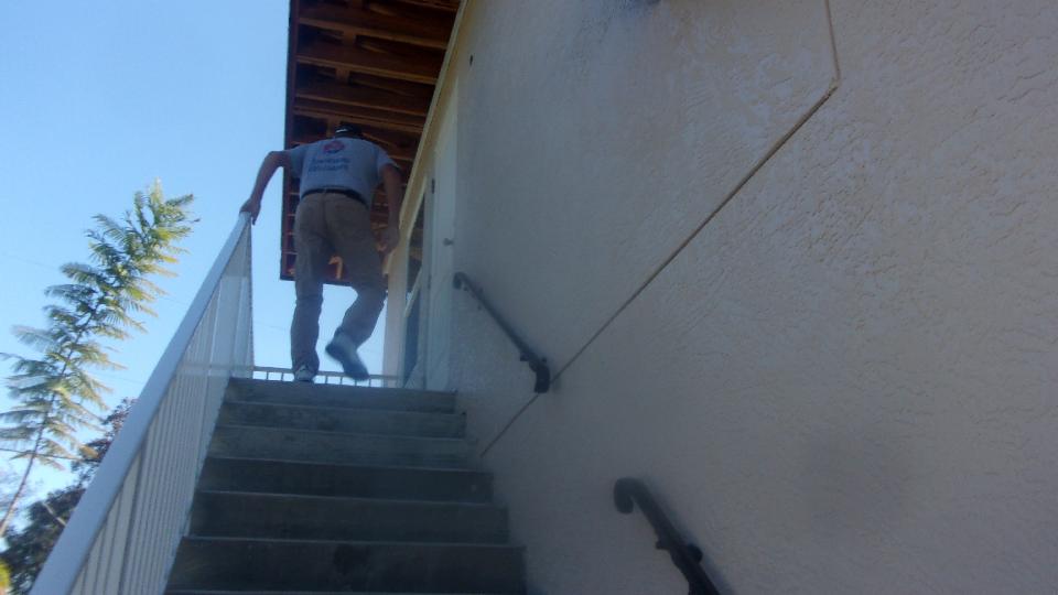 Out a side door an up a long flight of stairs to the second level to find a guest room/suite with lounge room, kitchen space, full bath facilities.