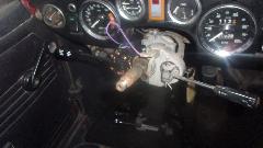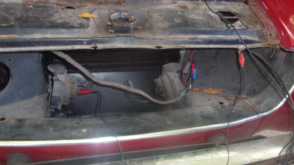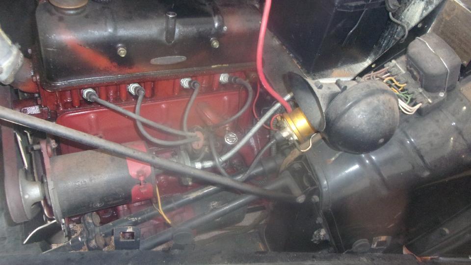 The rusty Midget was getting a little attention in the background, installing the new lighting switch and multi-function switch for headlight dipper and turn signals. All headlights definitely work, not sure the turn signals were tested yet. We got sidetracked by the nonfunctioning hooters. With power jumper and grounding wire efforts, both hooters were absolutely dead, and no electrical connection in the harness wire between the horns and connector at the new switch. That is a very rare situation to have a broken wire inside the harness. After installing a harness bypass wire from front to switch connector, we were using a motor powered instant-on air horn for testing, and it worked, but not enough space to install the big beast of a trumpet. A bit later we found a neat little motorcycle twin-tone air horn in the attic, cleaned up the power spade connectors, and that works too, so a new freebie for the Midget to be installed later.