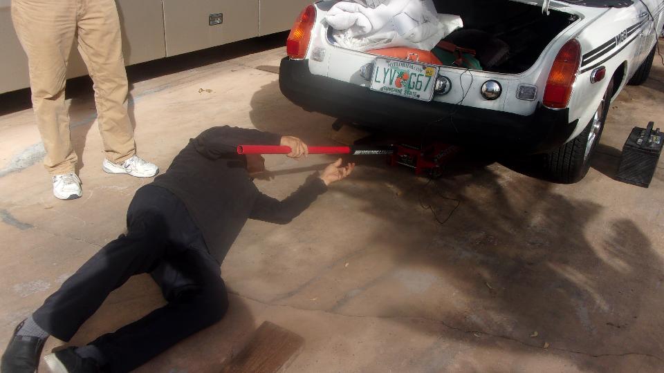 Up early with a few data chores to do, and Tito had a school appointment at 11-am, so we got back to work about 1-pm. Diagnostic work first. Jack it up, get under with a big wrench for leverage. I pull the lever while Tito steps on the clutch pedal, push and hold the lever back while Tito gives it a double pump, resulting in 3/4-inch of slave and clutch lever motion (50% more than normal), but still no clutch release. Was working when parked, about four months earlier. I recon 98% chance the friction disc is stuck to the flywheel. Can't do the driving tricks to release it until we get the hydraulics working properly.