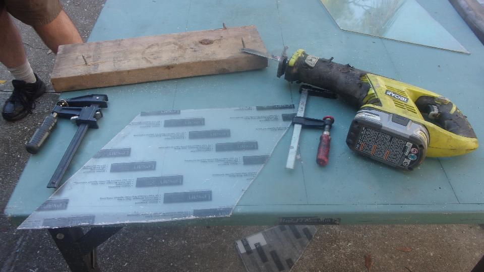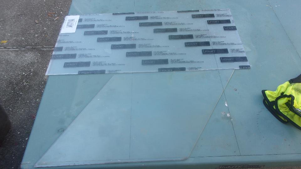 After everyone packed up to leave, we took a short trip to the local Home Depot store to pick up a 1x2 foot sheet of 0.093-in thick Lexan acrylic. Using the left side curtain panel for a template, a few scratches here and there, and some noisy work with a Sawzall. Follow that with some flat table top edge sanding with coarse to fine sand paper and deburring, and our MGA had a replacement for the right side Perspex panel that blew out a few days ago while flying down the expressway.