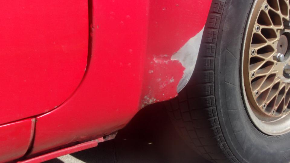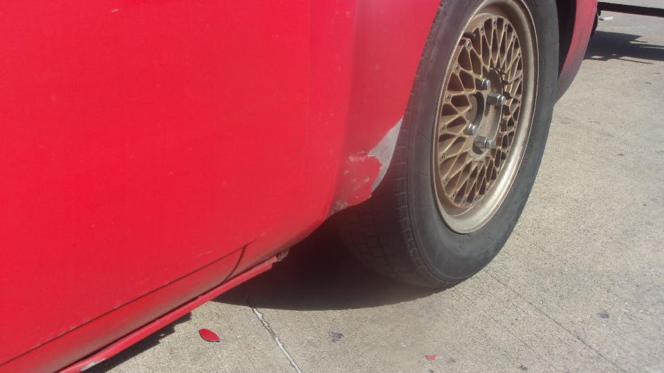 Somewhere in between there the car LF tire kicked up something rather heavy and solid which hit the fender flare on the LR wing dog leg, making a notable dent and flaking off the paint. At least it is in an easy access area, just remove the wheel for access to hammer it out and repaint. Keep in mind for the next opportunity for another body work session.