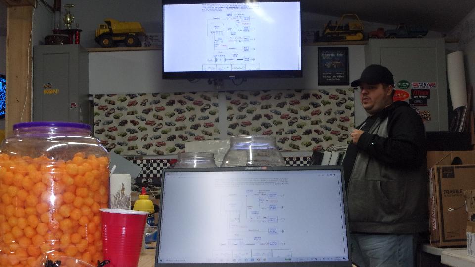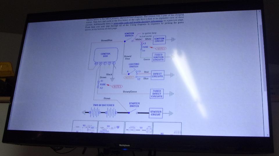 Notice the Jaguar E-Type 2+2 Coupe on the top rack. That one is destined to get a top crop to turn into a convertible soon, as well as a Corvette engine conversion. The original engine is in another room, more on that later. Then onto the MGA with electrical issues (maybe). Good facilities here, so we pulled up the MGA wiring diagrams from my web site on the large wall monitor.