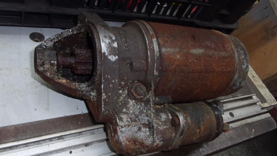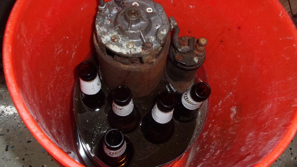 Have a notion wanting to test run it, but the starter motor is rusted solid. Put penetrating oil on the drive end bushings, and remove the tail cover (with lots of aluminum corrosion inside) to oil the brushes end bushing. Still no turn, so we dunked the drive end in a bucket of Evapo-Rust, adding a few bottles for displacement to bring the fluid lever a little higher, that one will soak for a while.
